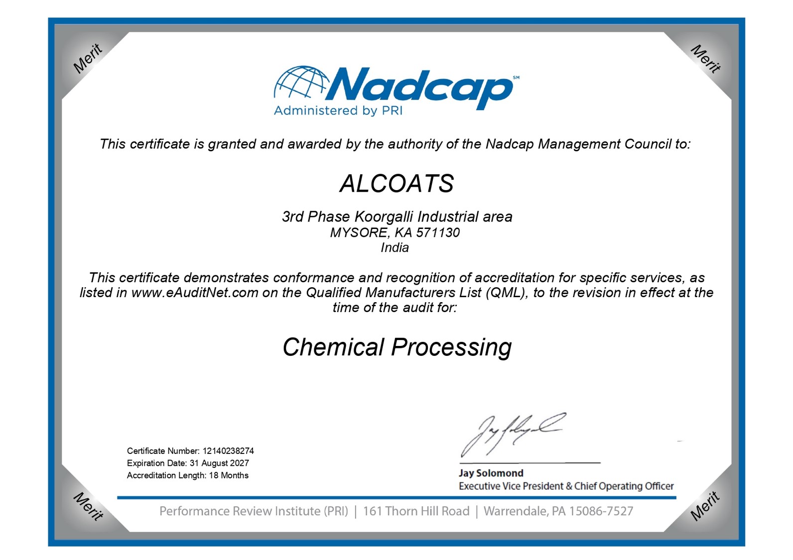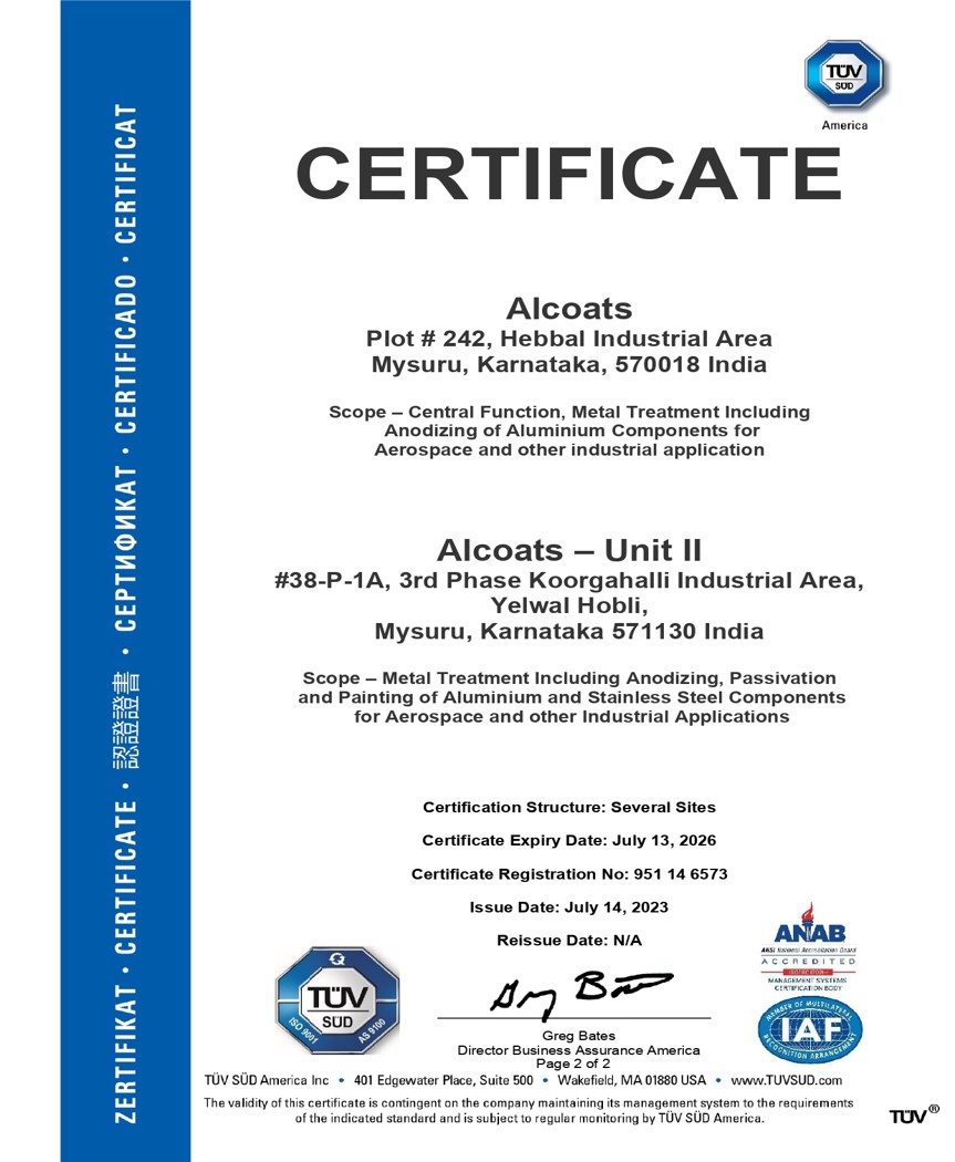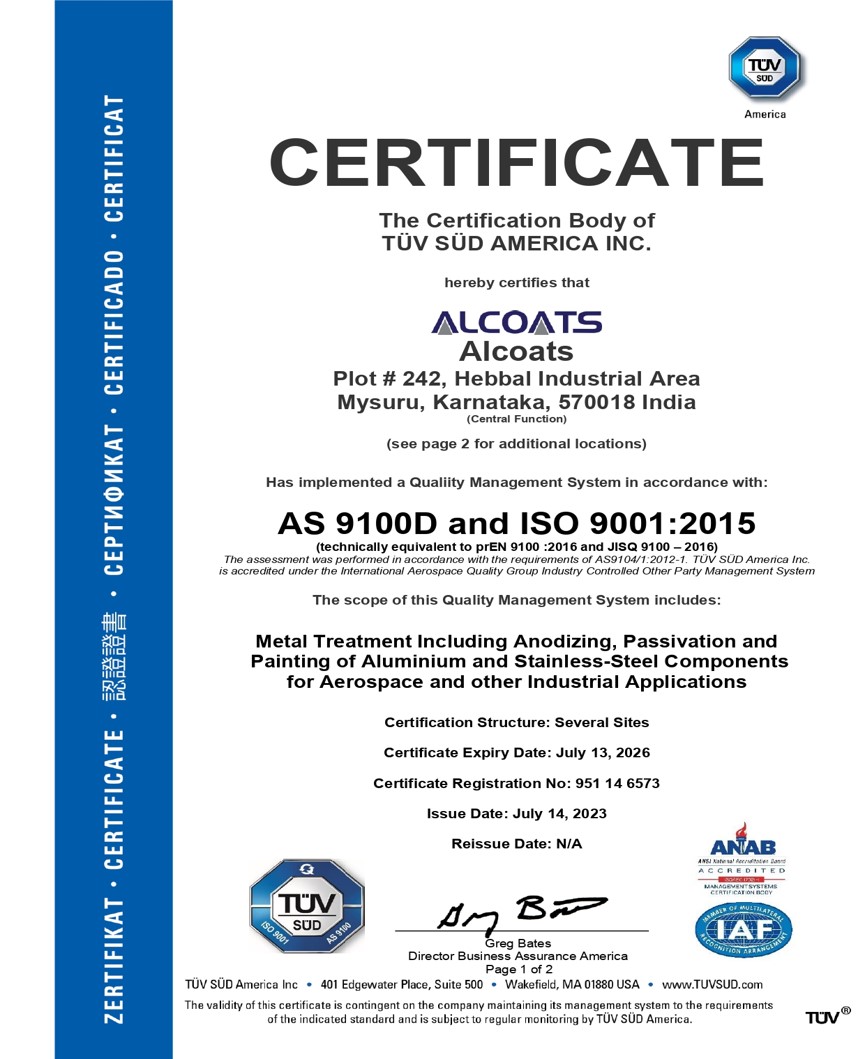ALCOATS was started in 1999 by Mr. Bapu Ramesh. ALCOATS first started with hard anodizing process and then added all types of anodizing to the scope. Unit 2 (Koorgahalli Industrial Area) was started in 2013 for sole purpose to serve to Aerospace and Defense sectors. ALCOATS secured certification of AS9100 in 2013 and NADCAP in 2015. ALCOATS is currently in Merit cycle with NADCAP certification. ALCOATS has completed many prestigious projects collaborating with major OEM’s like ISRO, VSSC, Lockheed Martin, Honeywell, SAFRAN, RAFAEL, EATON, Elbit, IAI,Thales Parker, DRDO And BDL .